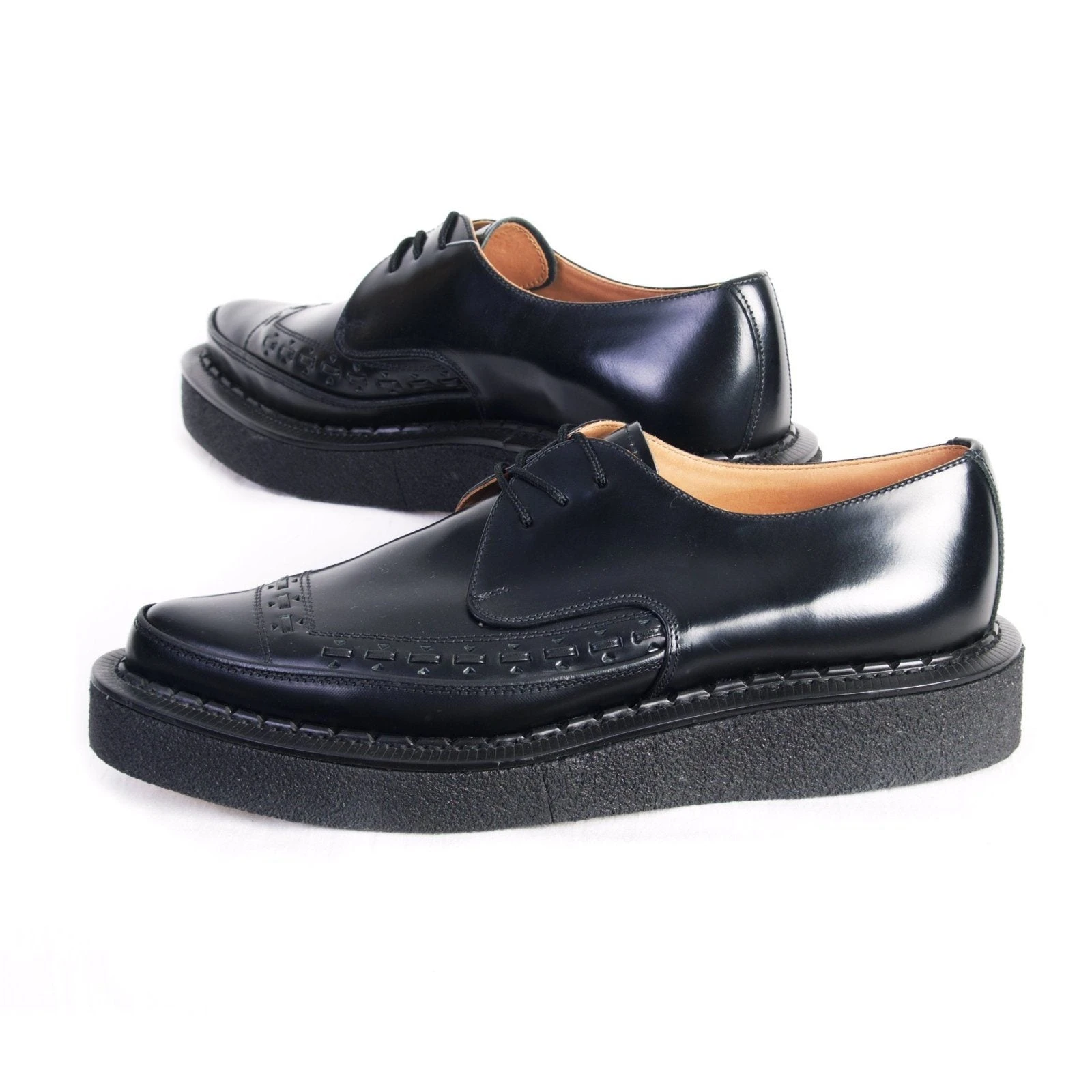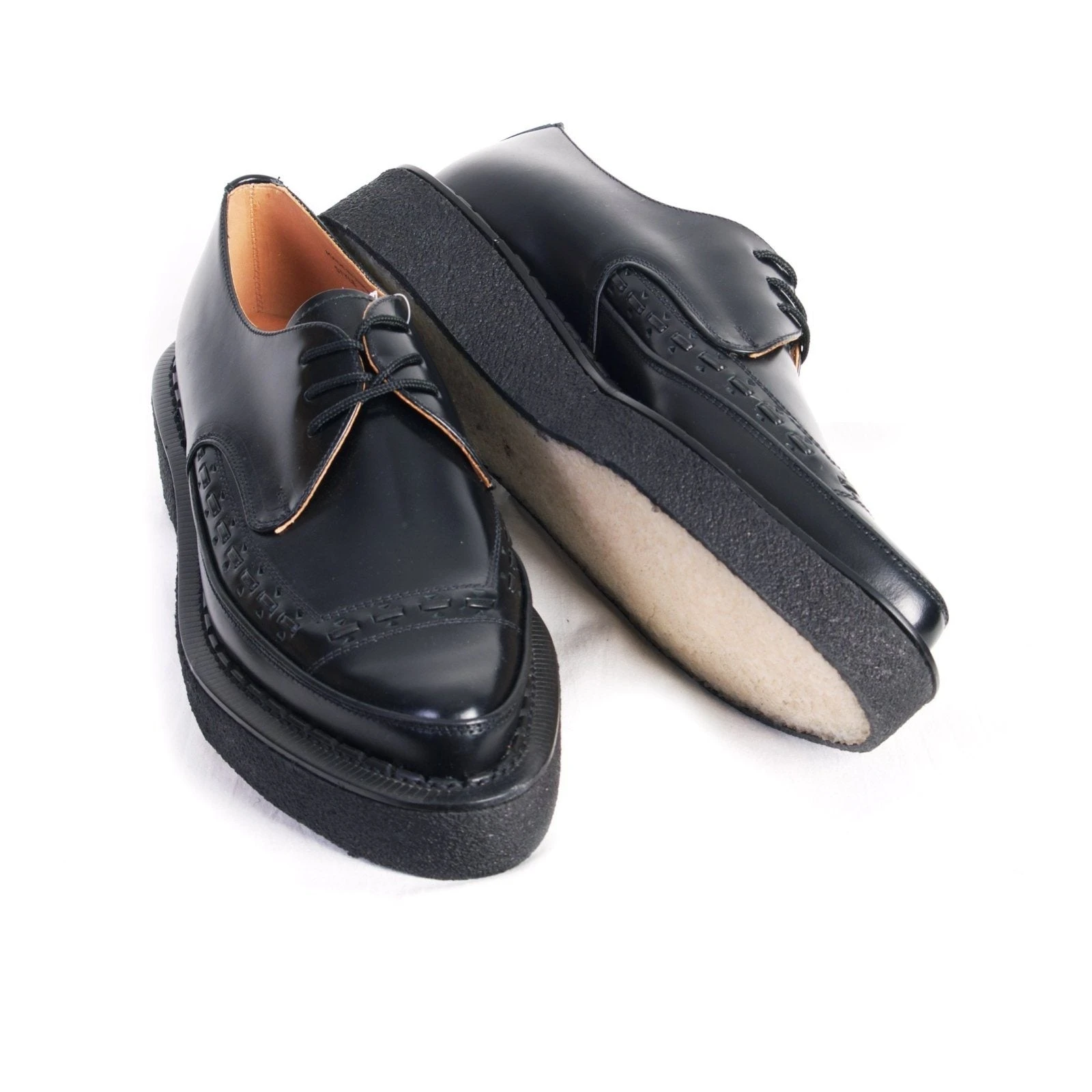 The original “Diano” creeper in black leather, with Goodyear welted crepe sole. Made since the late fifties, reborn for the punk generation. V sole 24mm front, 36mm back.