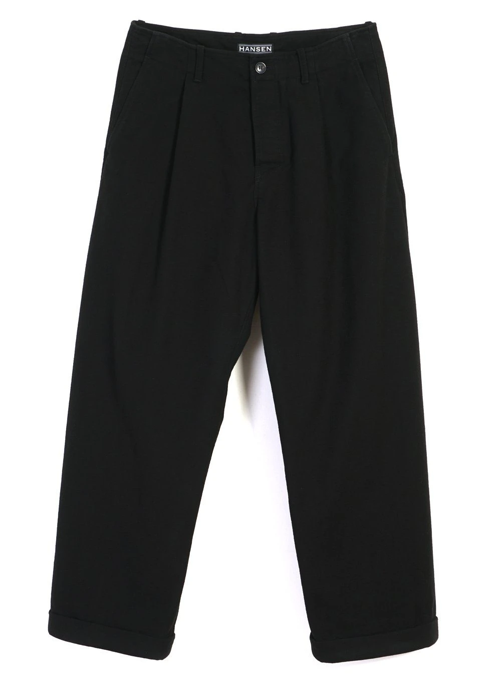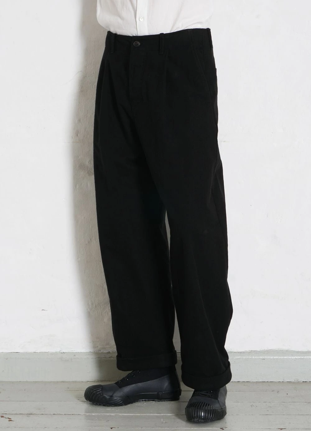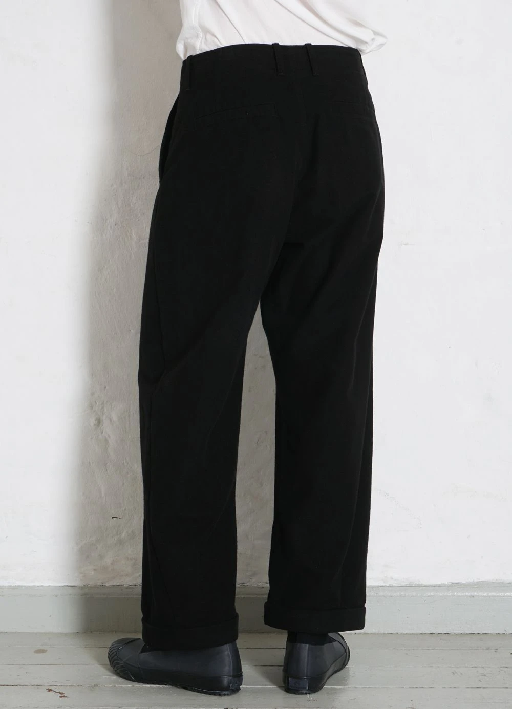 BOBBY is a newcomer for the AW21 season. The legs are cut super wide with a bit tapered leg and a twisted side seam. Details include single pleat fronts, welted back pockets, button fly and fold-up cuffs.