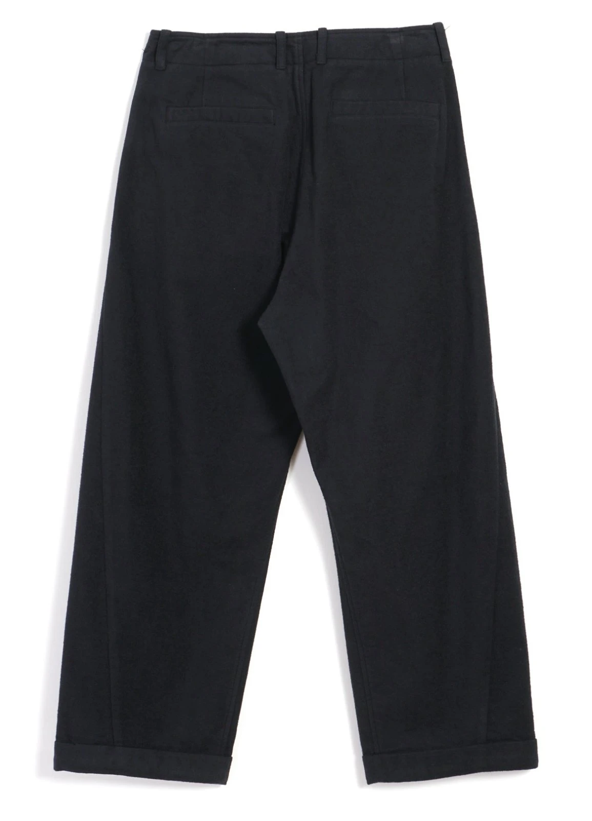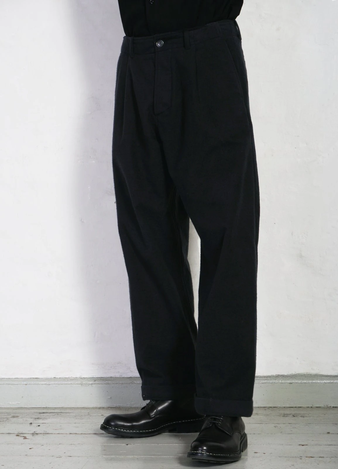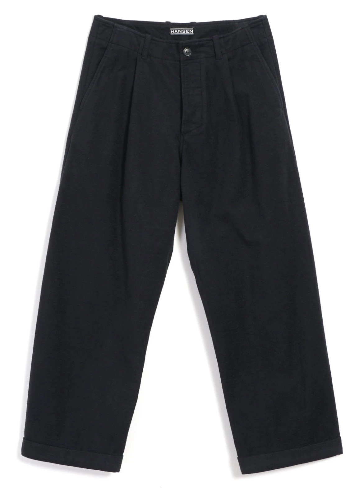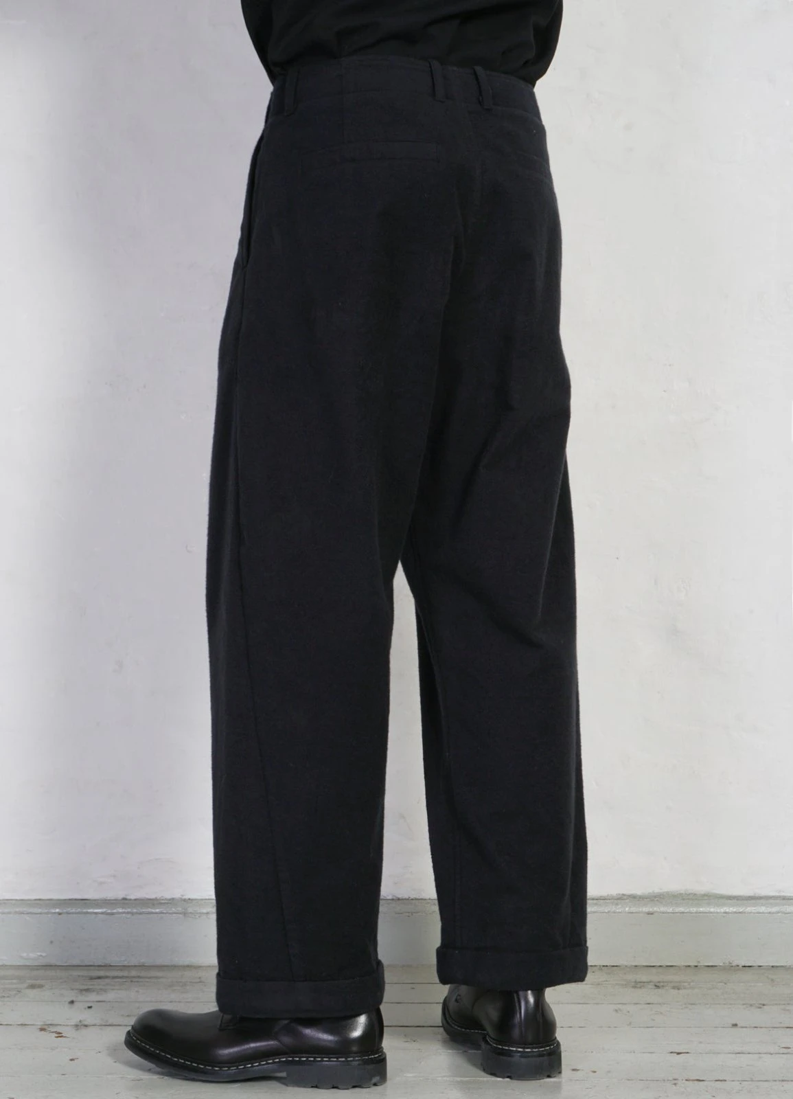 BOBBY is the widest cut trousers in the collection. Details include single pleat fronts, welted back pockets, button fly, fold-up cuffs and a twisted sideseam for a more organic shape.