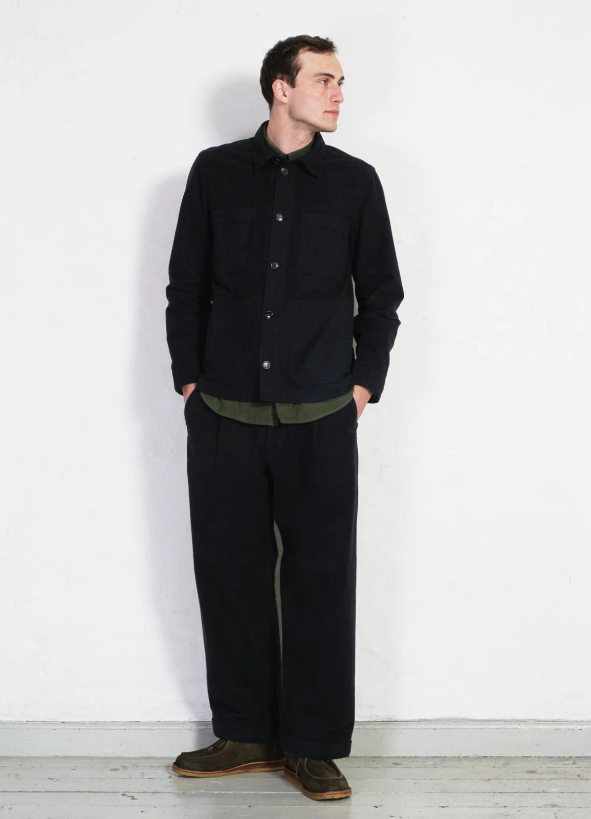 The fabric is a classic satin woven moleskin. Heavy, brushed, soft and durable. A great fabric all through autumn, winter and spring, with styles that refer to workwear.