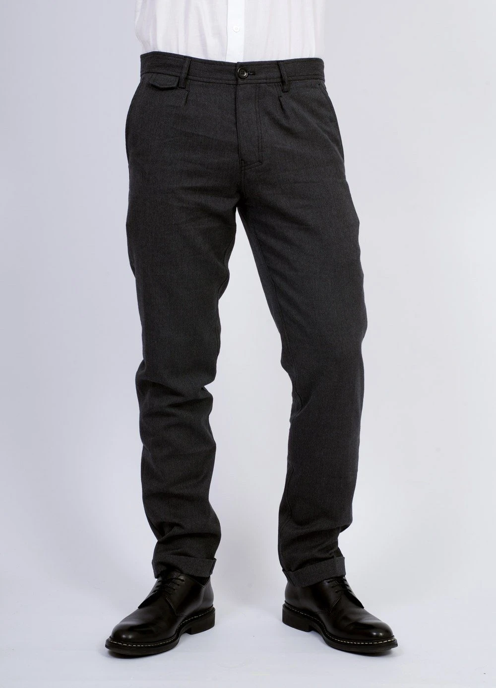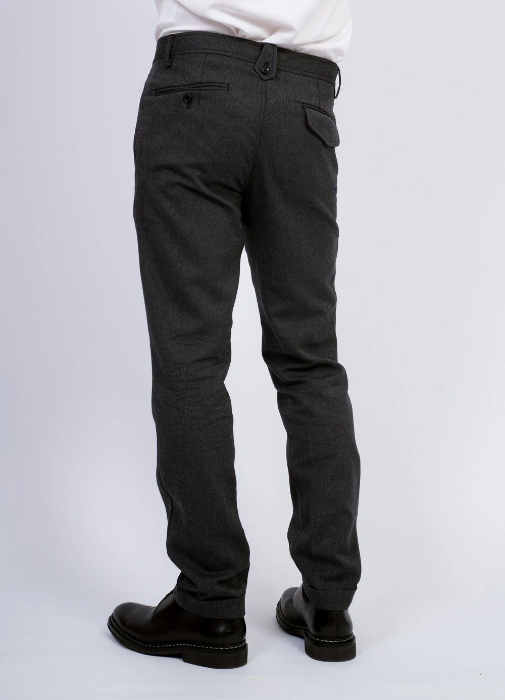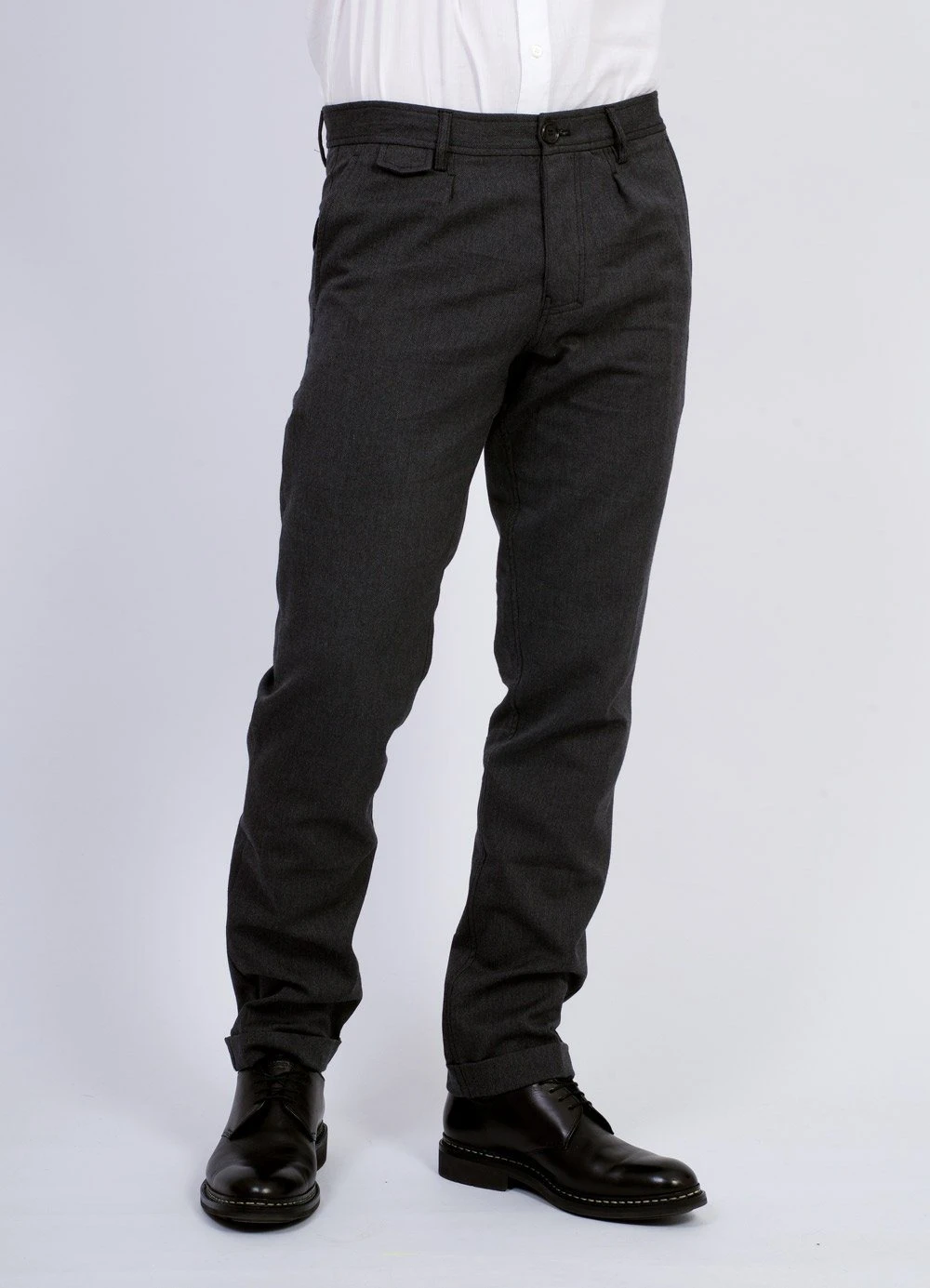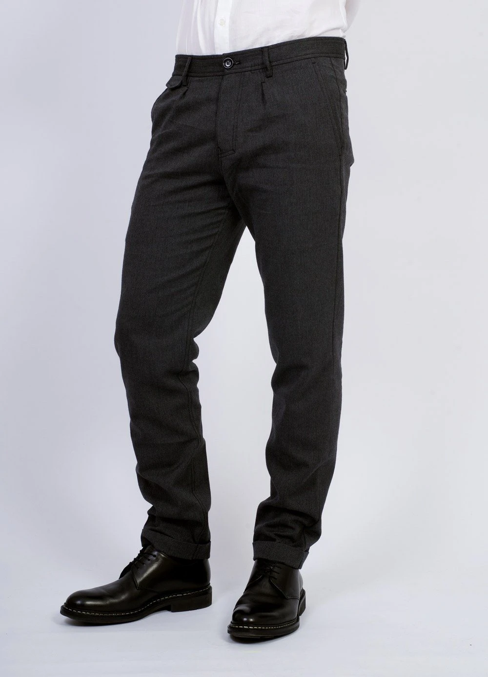 Frank is a mash-up of classic men’s suit trousers and chinos. Suiting references include pleats on the front, cuffed leg and lined waistband, while the work wear-inspired double top-stitching makes the trousers less formal.