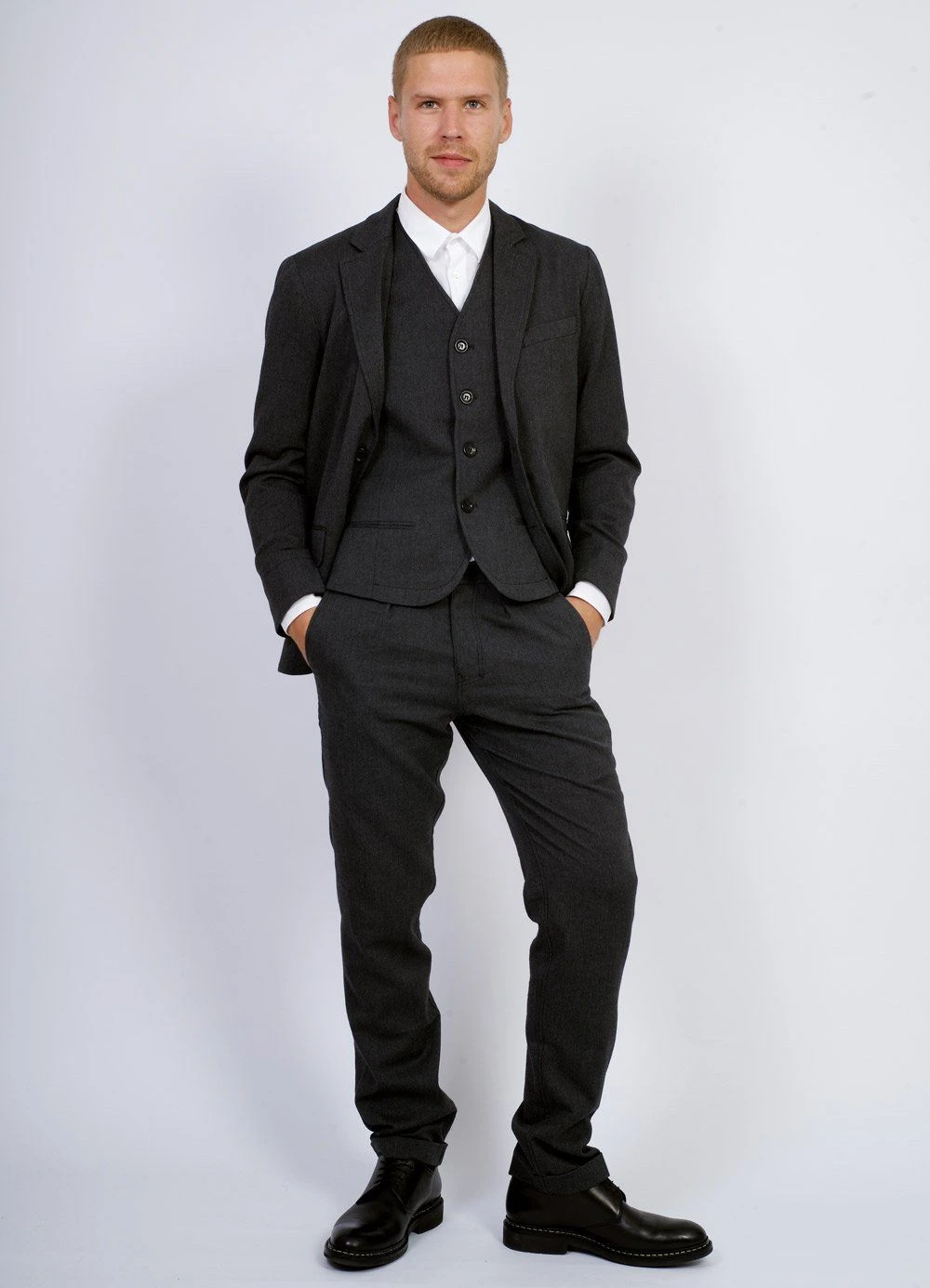 The yarn dyed Italian fabric is a fine herringbone construction in grey melange and black. It is made from 52% wool and 48% cotton, which give it a soft and exclusive touch. The fabric is probably the most classic looking in the collection.