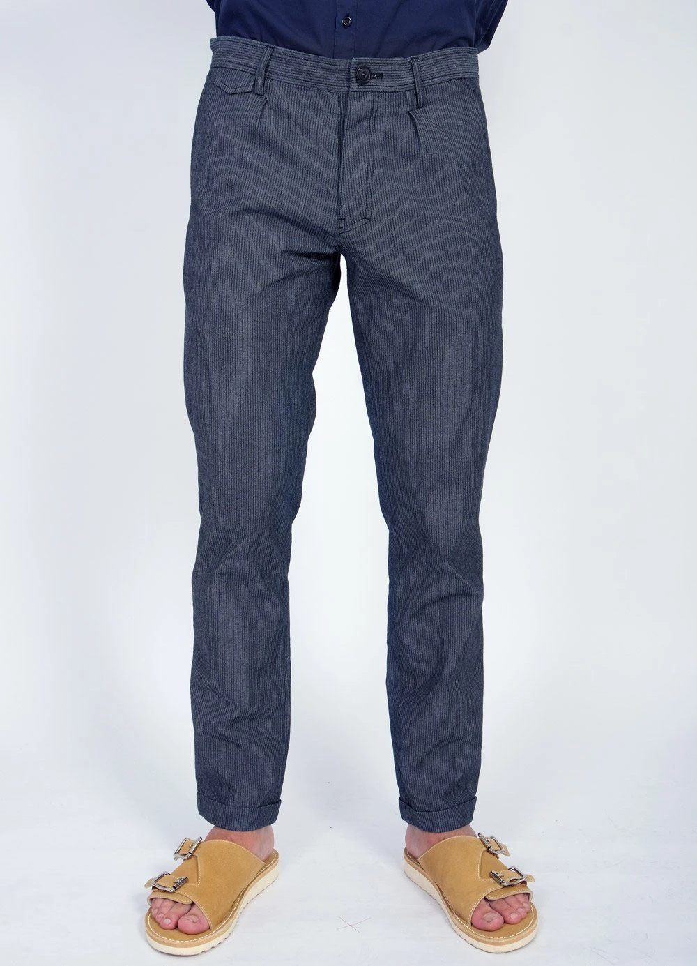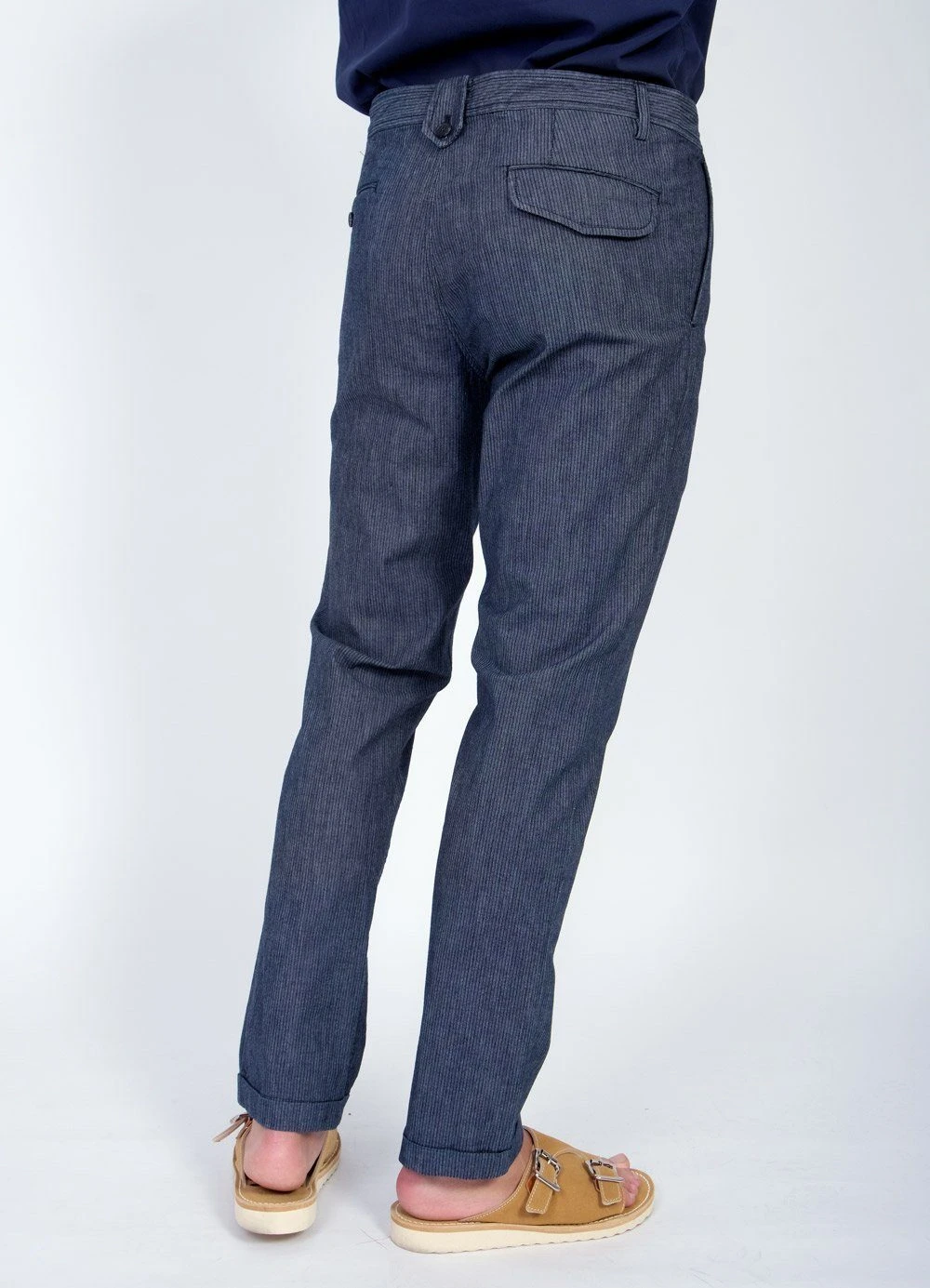 The fabric is made by one of Italy’s most famous denim mills named Berto. It is a 7,6oz. yarn-dyed fabric with small stripes and for comfort it has 2% elastan. We have washed the garment ones to reduce the bleeding of the indigo.