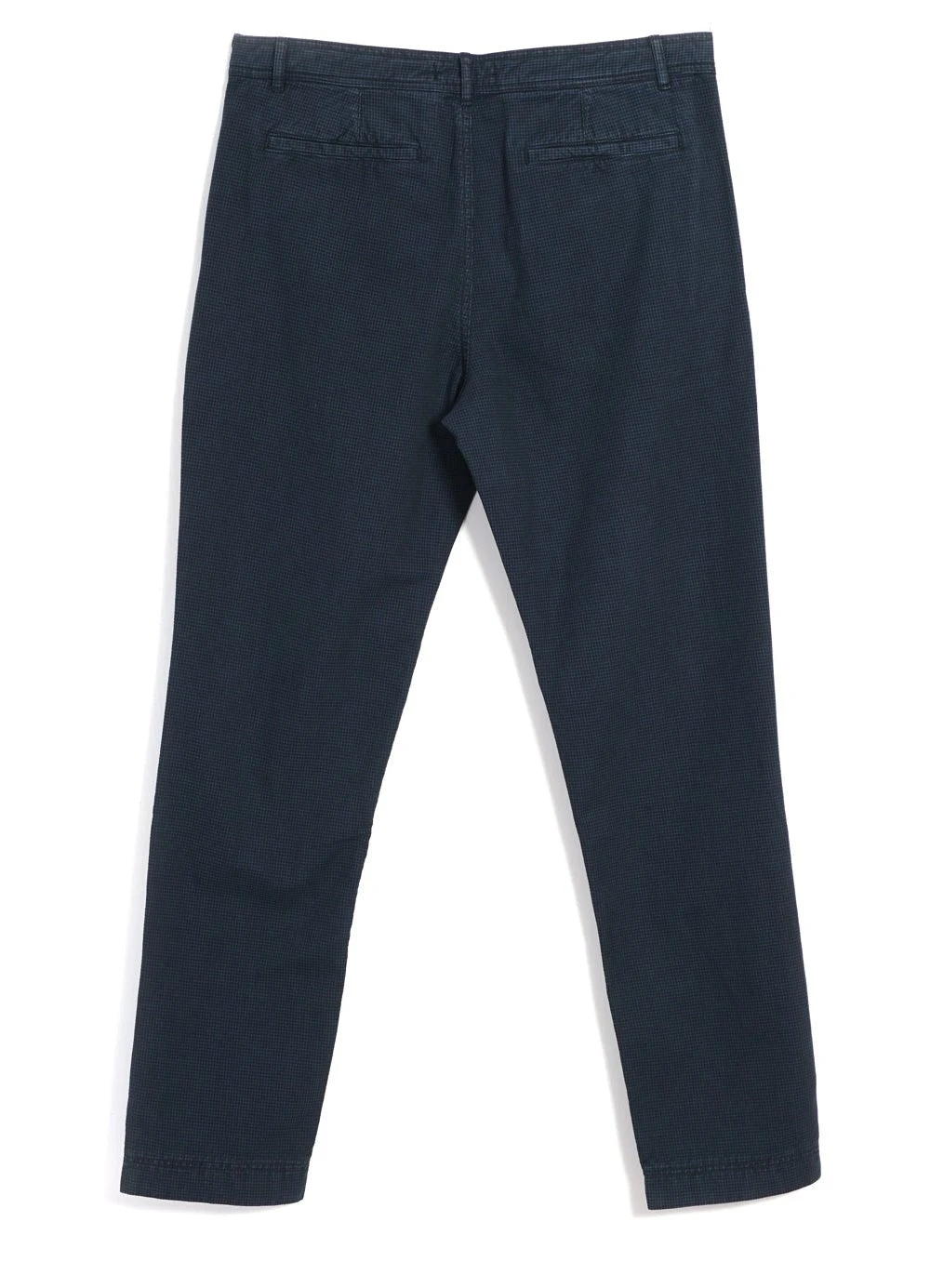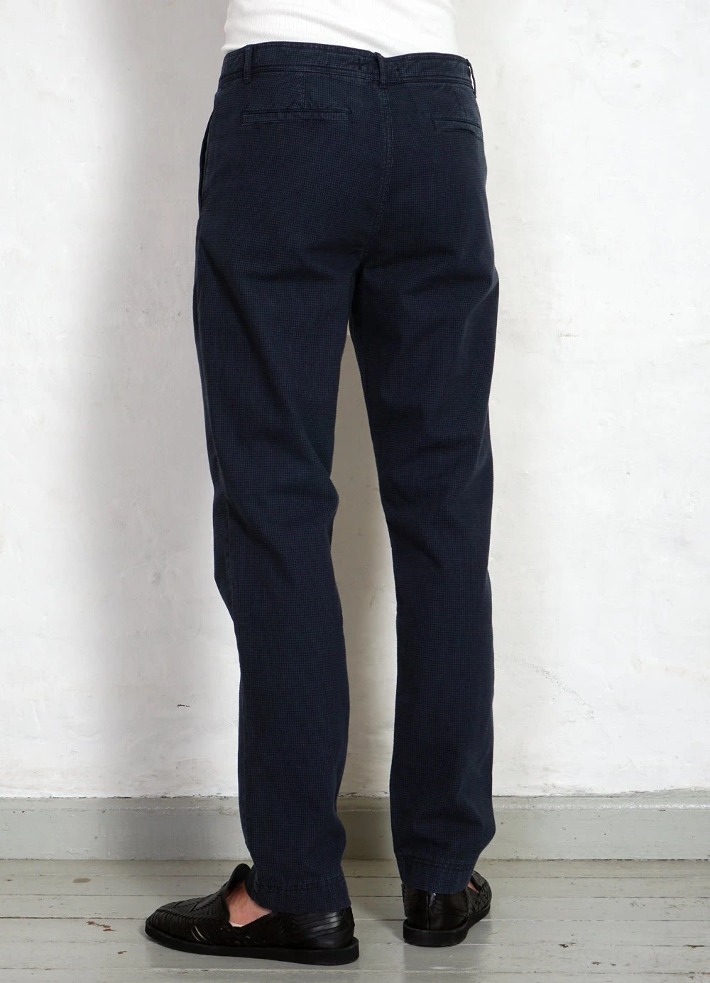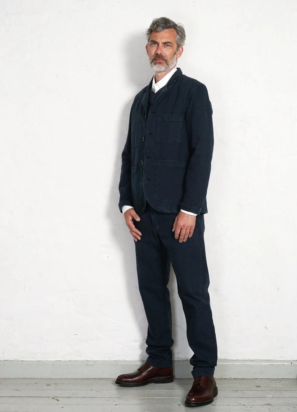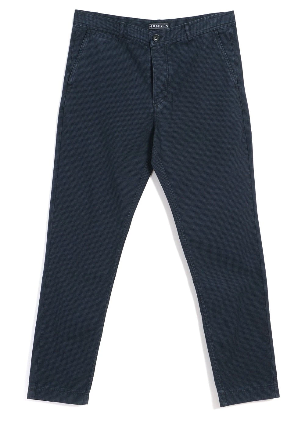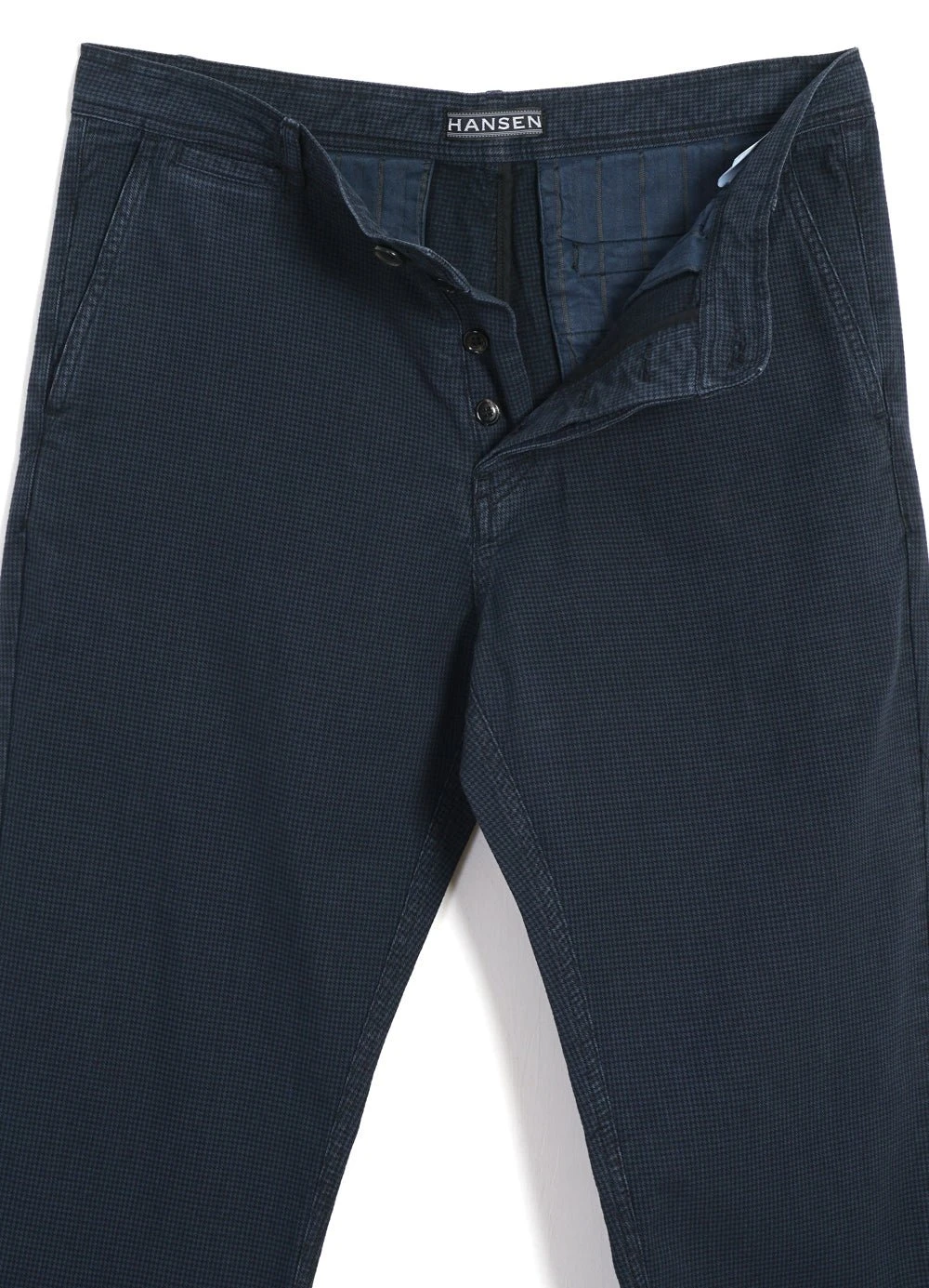 A Portugese cotton with a hounds tooth pattern. The fabric is originally black and white, then over-dyed. This process makes a really relaxed and casual feeling. A subtle yet very stylish look that we treasure very highly at HANSEN Garments.