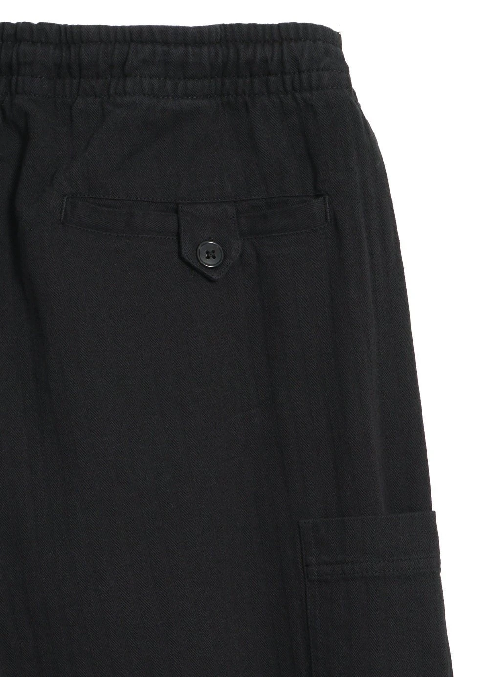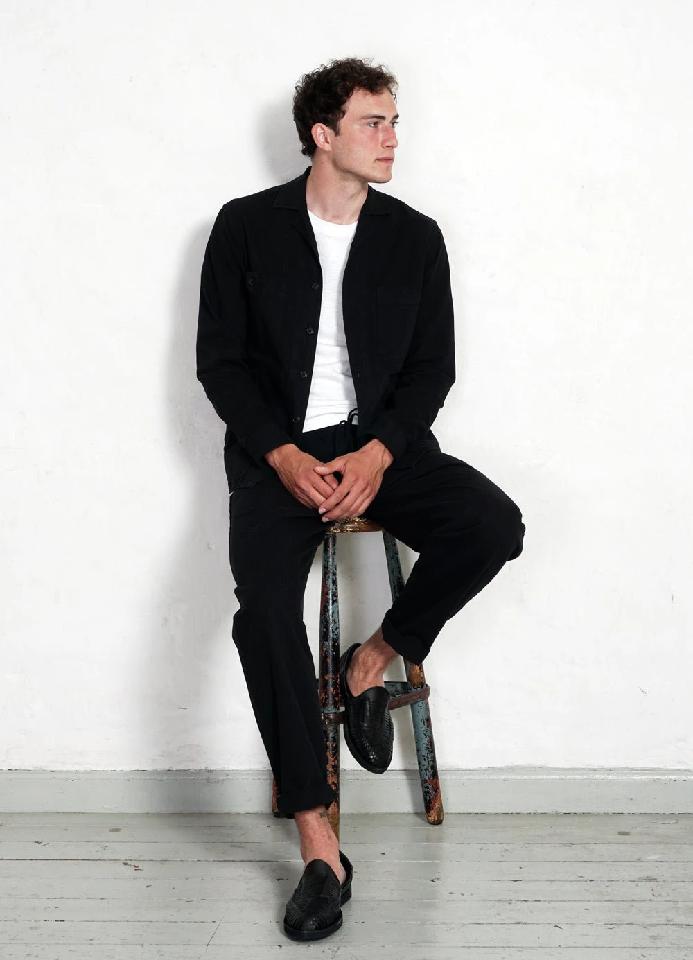 An Italian sturdy cotton Herringbone weave. For a softer and casual feel the garments have been over-dyed, washed and tumbled.