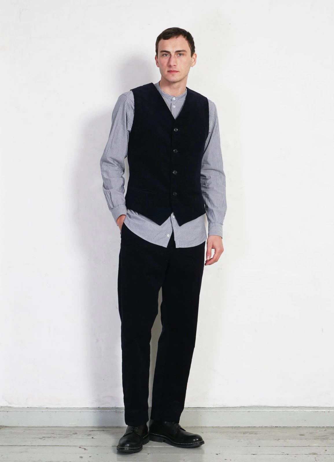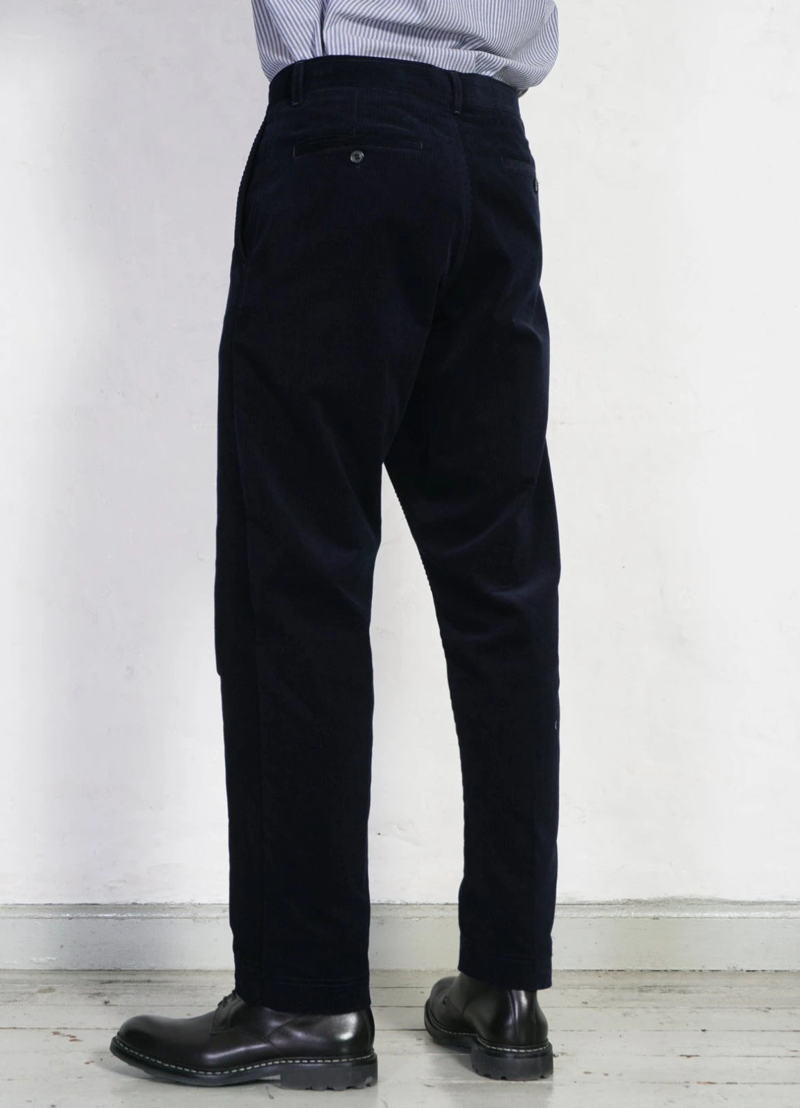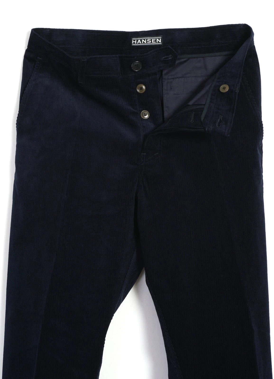 We used a navy blue, Italian fine striped cotton corduroy, which makes the trousers a light weight all year round classic wear.