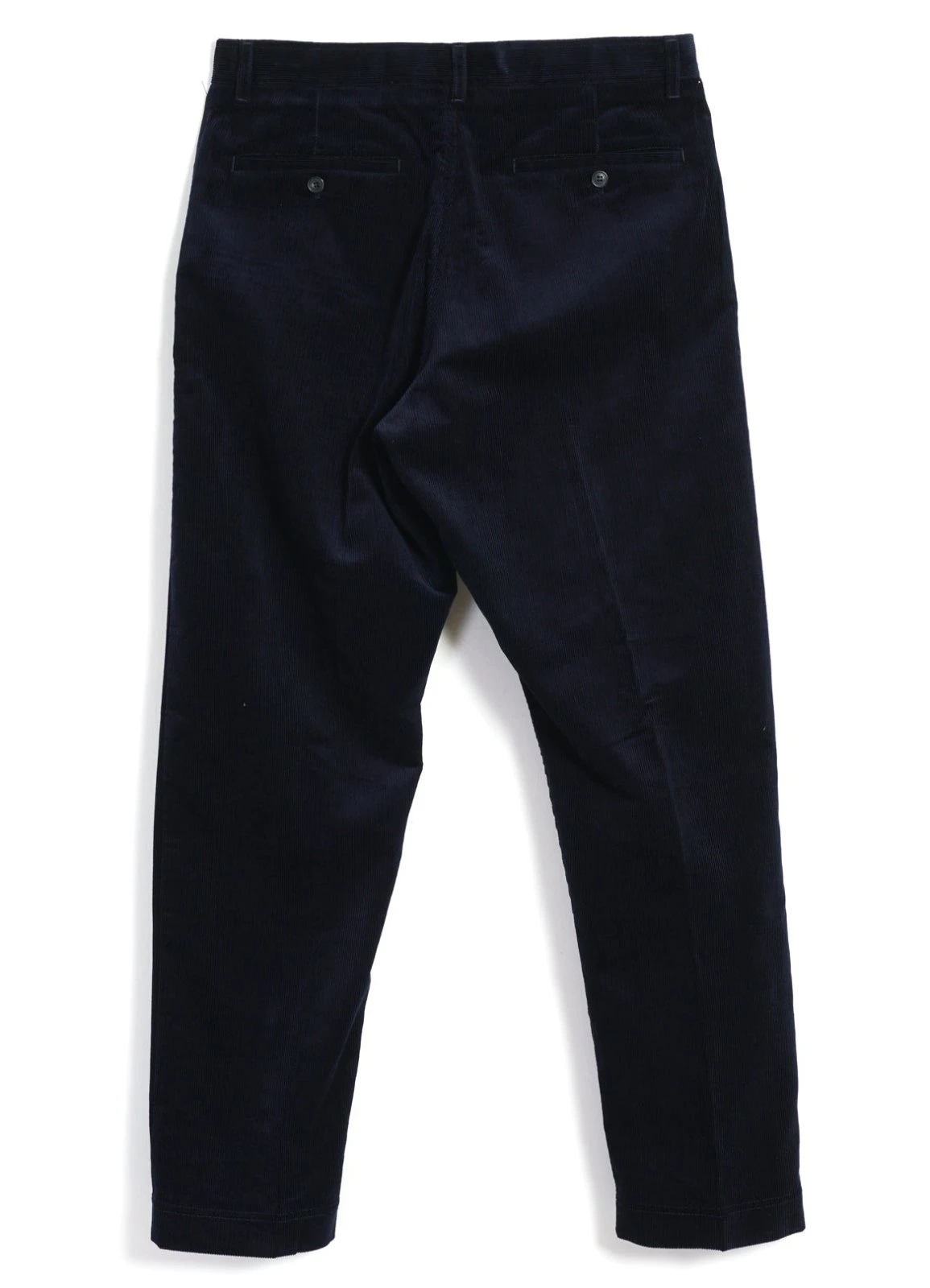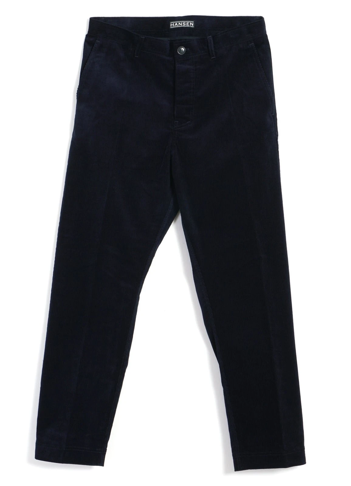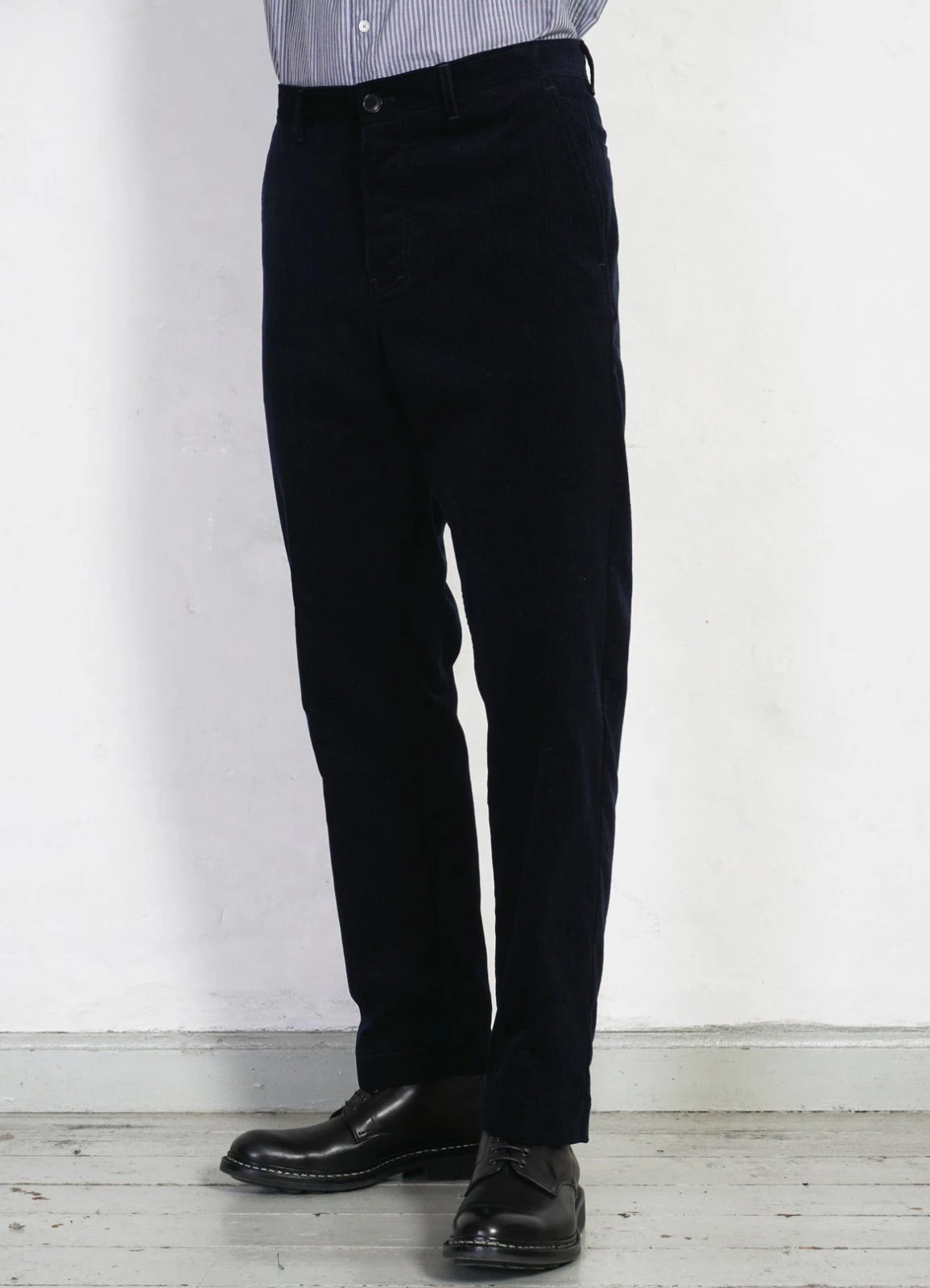 We used a navy blue, Italian fine striped cotton corduroy, which makes the trousers a light weight all year round classic wear.