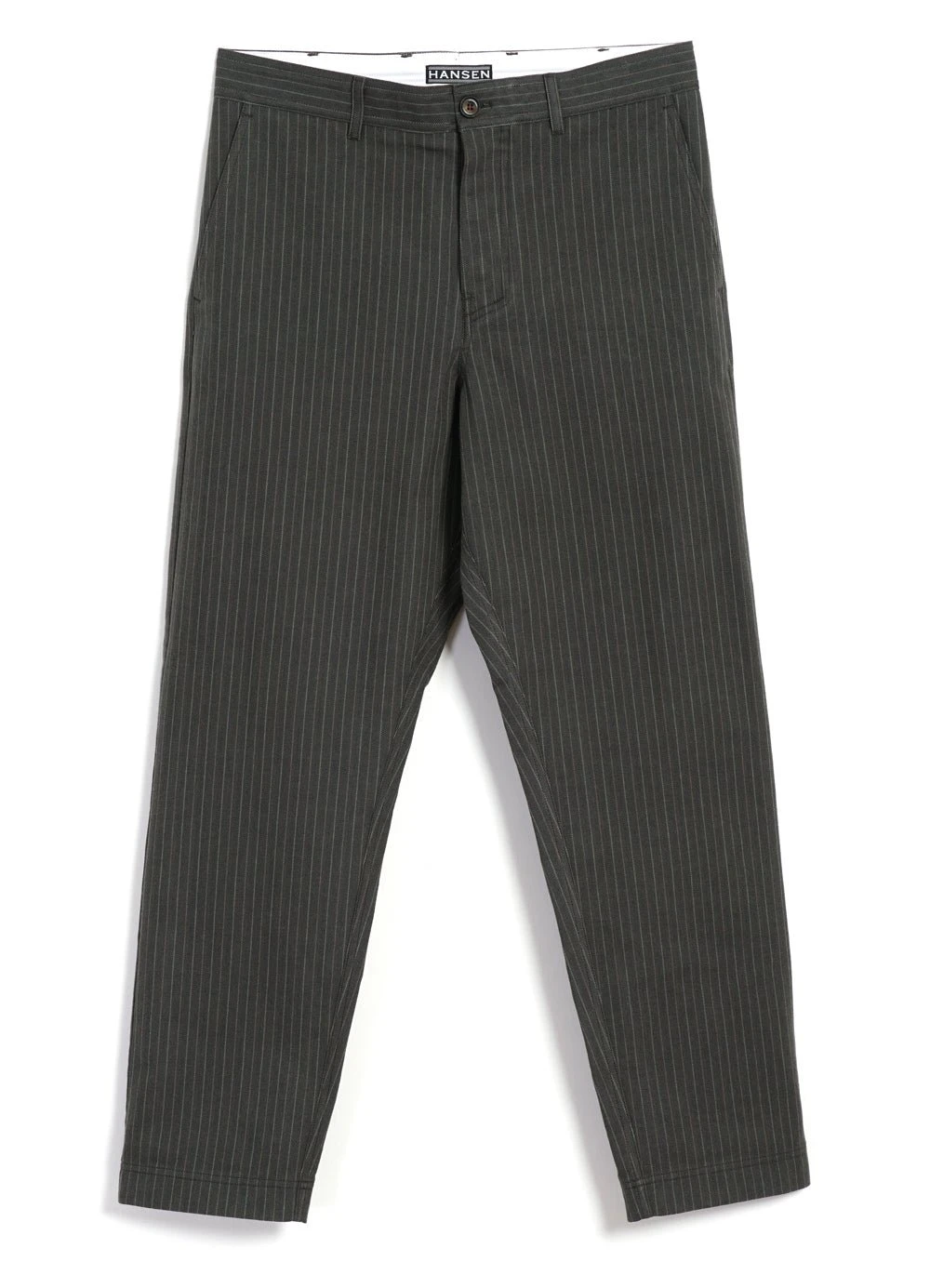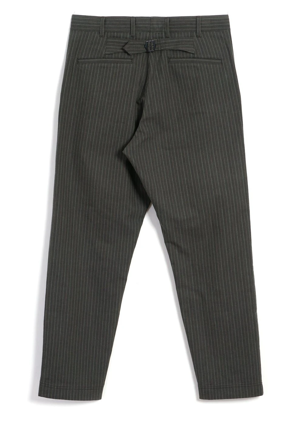 KIAN is a loosely fit trouser with influence from both tailoring and work wear. It has slanted front pockets, two welted back pockets, a rubber grip waistband and back cinch. The rubber grip waistband is well suited for tucking the shirt.