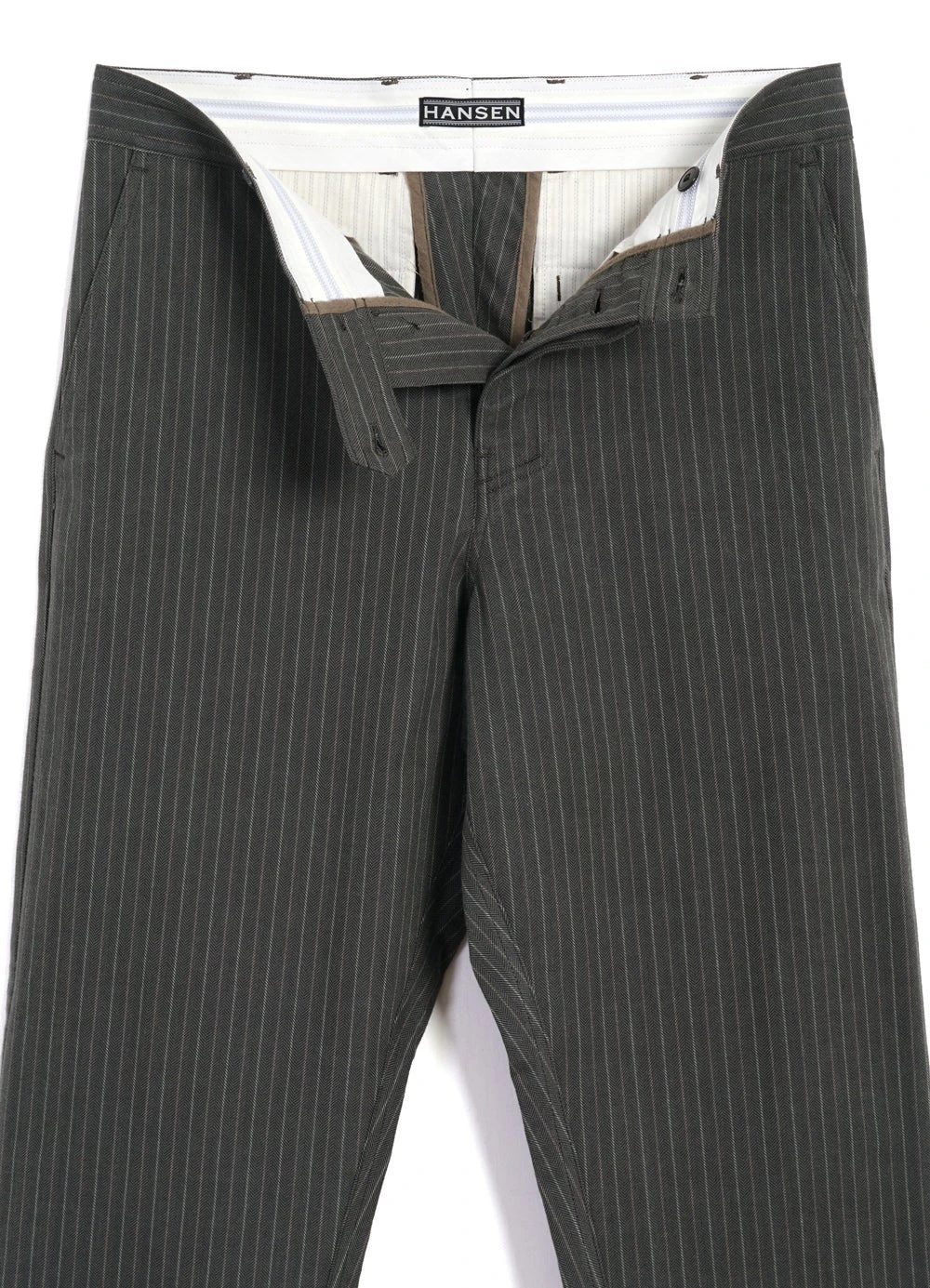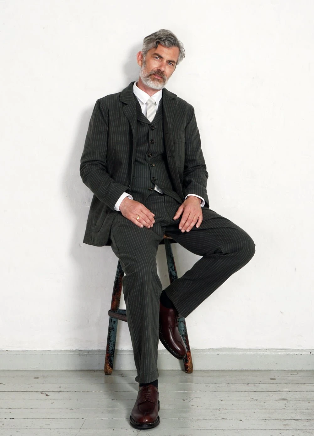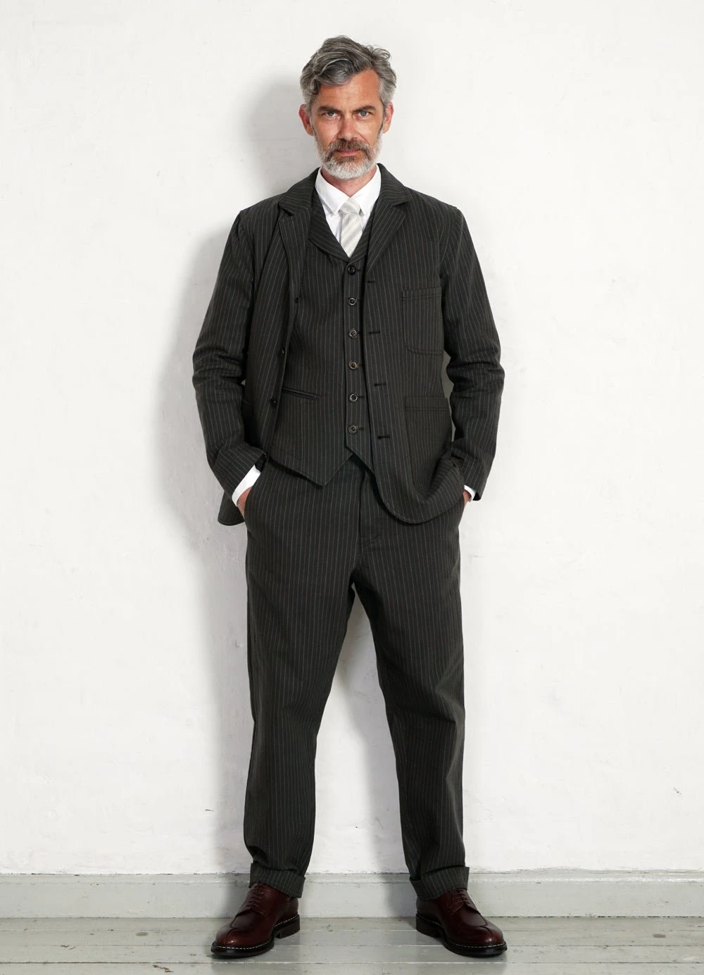 The fabric is a combination of a Herringbone weave and Pinstripes. It is made of 100% cotton with a pin striped pattern. It is classic and has strong traditions within men’s clothing with references to power and wealth. Pin stripes origins from uniforms worn by those who worked in banks, for the purpose of easily being recognized and not mistaken for being robbers or other intruders. In this case the colour gives the classic pinstripe a new more relaxed twist.