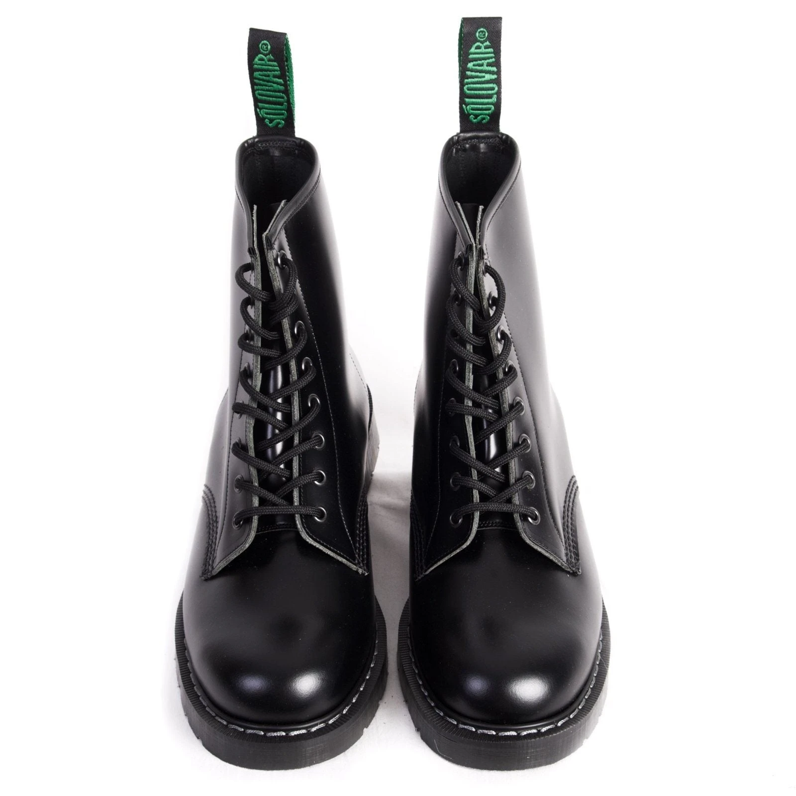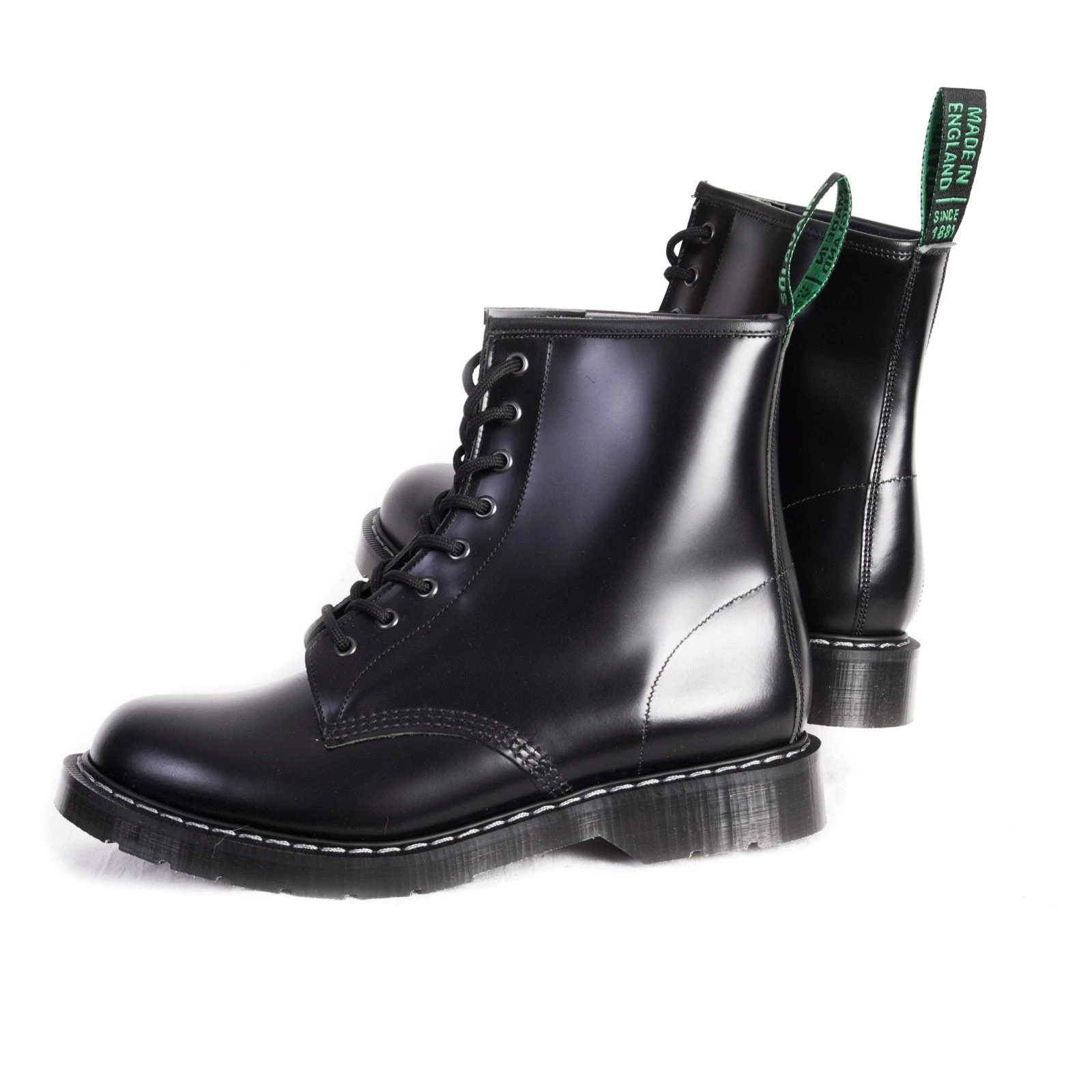 The 8-eyelet Derby Boot in hi-shine leather is Goodyear welted using Solovair’s renowned Soft Sole Suspension technology, which ensures comfort and durability. All boots and shoes are handcrafted in their factory, NPS Shoes, located in Wollaston, Northamptonshire.